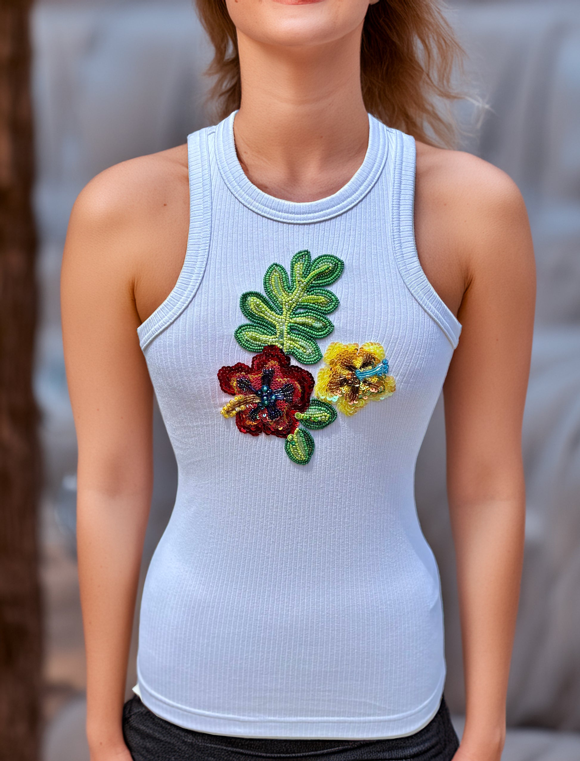Ten wyjątkowy, biały, prążkowany top z kultowej kolekcji Adidas x Karlie Kloss staje się dziełem sztuki, które można nosić, przeobrażonym w ręcznie haftowane kwiaty z koralików w żywych, tropikalnych barwach. Każdy płatek i liść został przyszyty koralik po koraliku, celebrując odważną kobiecość i magię slow fashion. Żadnych maszyn. Żadnych kopii. Tylko jedna para rąk — i jeden taki top.
