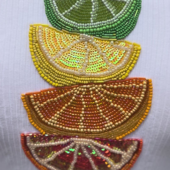 • Hand-embroidered with glass beads & sequins (citrus motif)