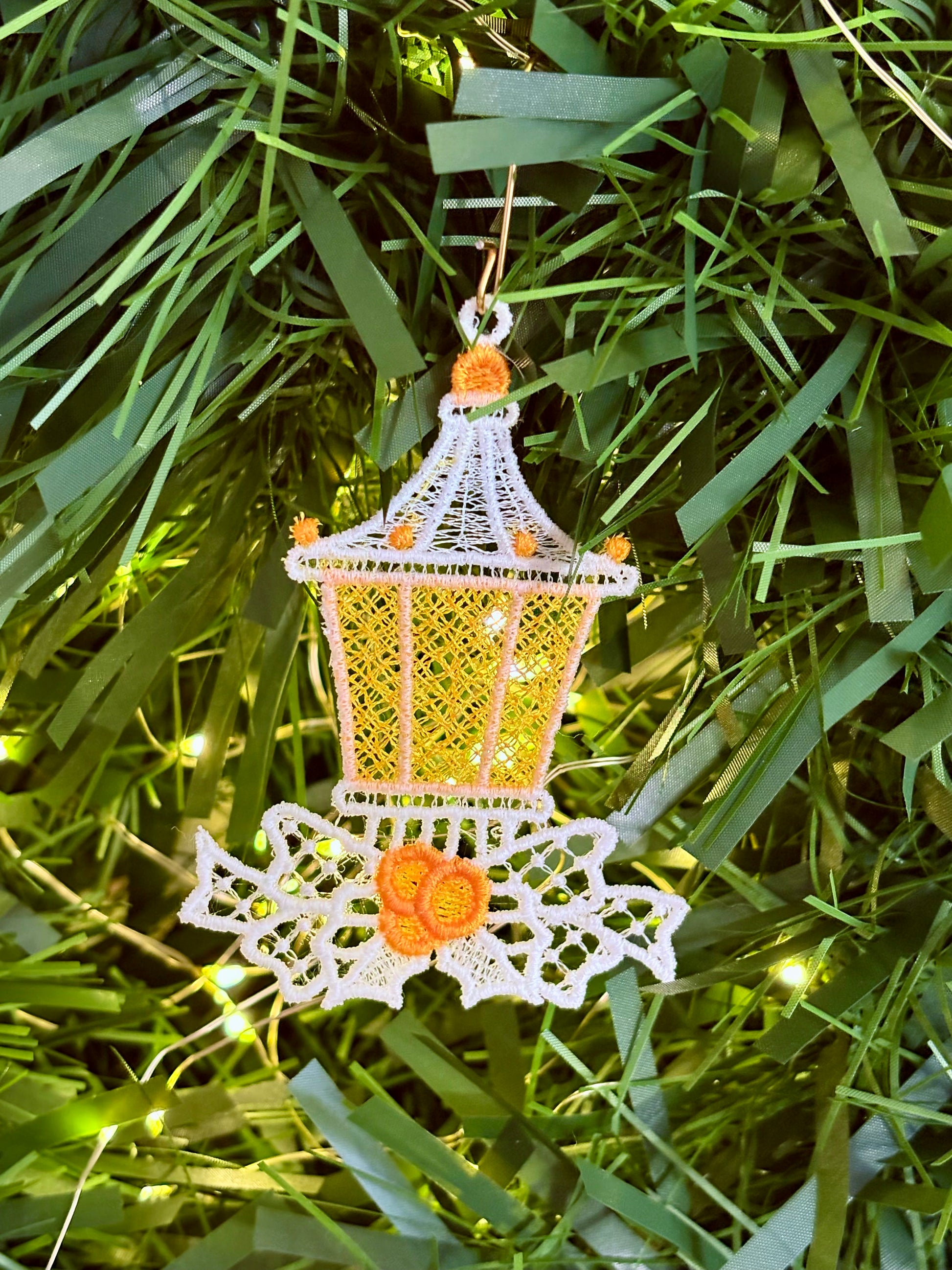 Our “Lantern” ornament brings a warm, vintage touch to your décor. Created with freestanding lace (FSL) machine embroidery, it’s light, intricate and beautifully catches the tree lights.